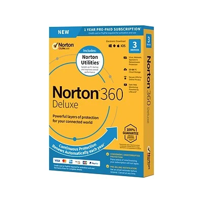 Norton™ 360 Deluxe – for up to 3 devices with Auto Renewal – provides you powerful layers of protection for your connected devices and online privacy. Your personal devices and information have protection as you bank, shop and post online, both at home and on public Wi-Fi. Norton Utilities fixes common issues that can cause PC slowdown – or worse, crashes – and helps keep your PC running smoother for longer.