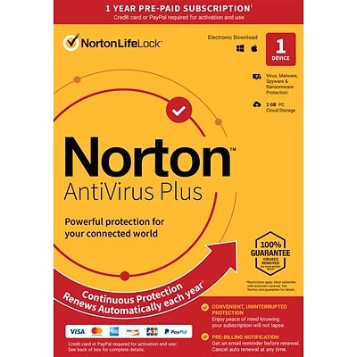 General Disclaimers & Disclosures No one can prevent all cybercrime or identity theft.¹ PAYMENT METHOD REQUIRED FOR 1 YEAR PRE-PAID SUBSCRIPTION: You are purchasing a recurring subscription which will automatically renew after the first year. To activate, you must enroll online and provide your billing information. The price paid today is valid for the first year of your subscription, and will automatically renew and charge your stored payment method the applicable renewal price found at www.us.norton.com/pricing. The price is subject to change, but will always send you a notification email in advance. You may cancel the automatic renewal by logging into your account, or contacting us at: 844-488-4540.Your coverage may include product, service and/or protection updates and features that may be added, modified or removed, subject to the applicable Terms & Conditions found on NortonLifeLock.com.Data collection, storage and use for subscription management and renewal purposes subject to our Global Privacy Statement found at www.nortonlifelock.com/privacy.² Requires your device to have an Internet/data plan and be turned on. *Virus Protection Promise: Restrictions apply. Must subscribe with automatic renewal. See Norton.com/guarantee for details.