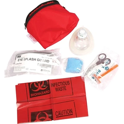 Rescue pack includes: CPR micromask, eye shield, two pairs of nitrile gloves, antiseptic wipes, towel, razor, scissors, and a bio-hazard bag