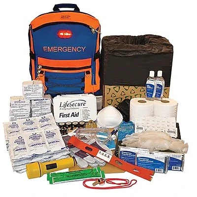 A portable emergency survival kit for evacuating up to 30 people or supporting them in place for several hours after an emergency or disaster. Emergency survival backpack with high-visibility markings and LED safety signal provides added safety in use. Portable fold-flat toilet stores in the survival backpack with other survival supplies